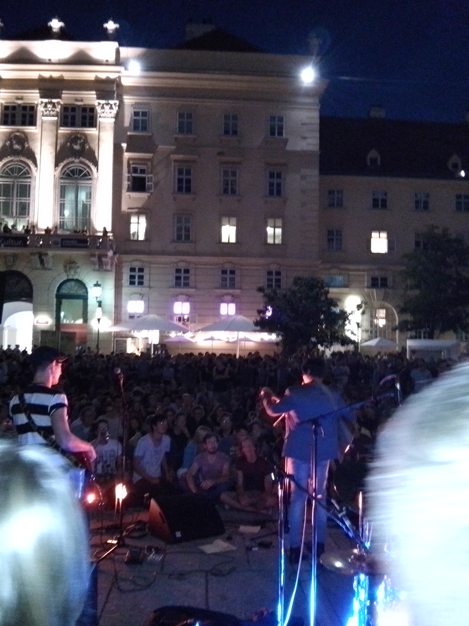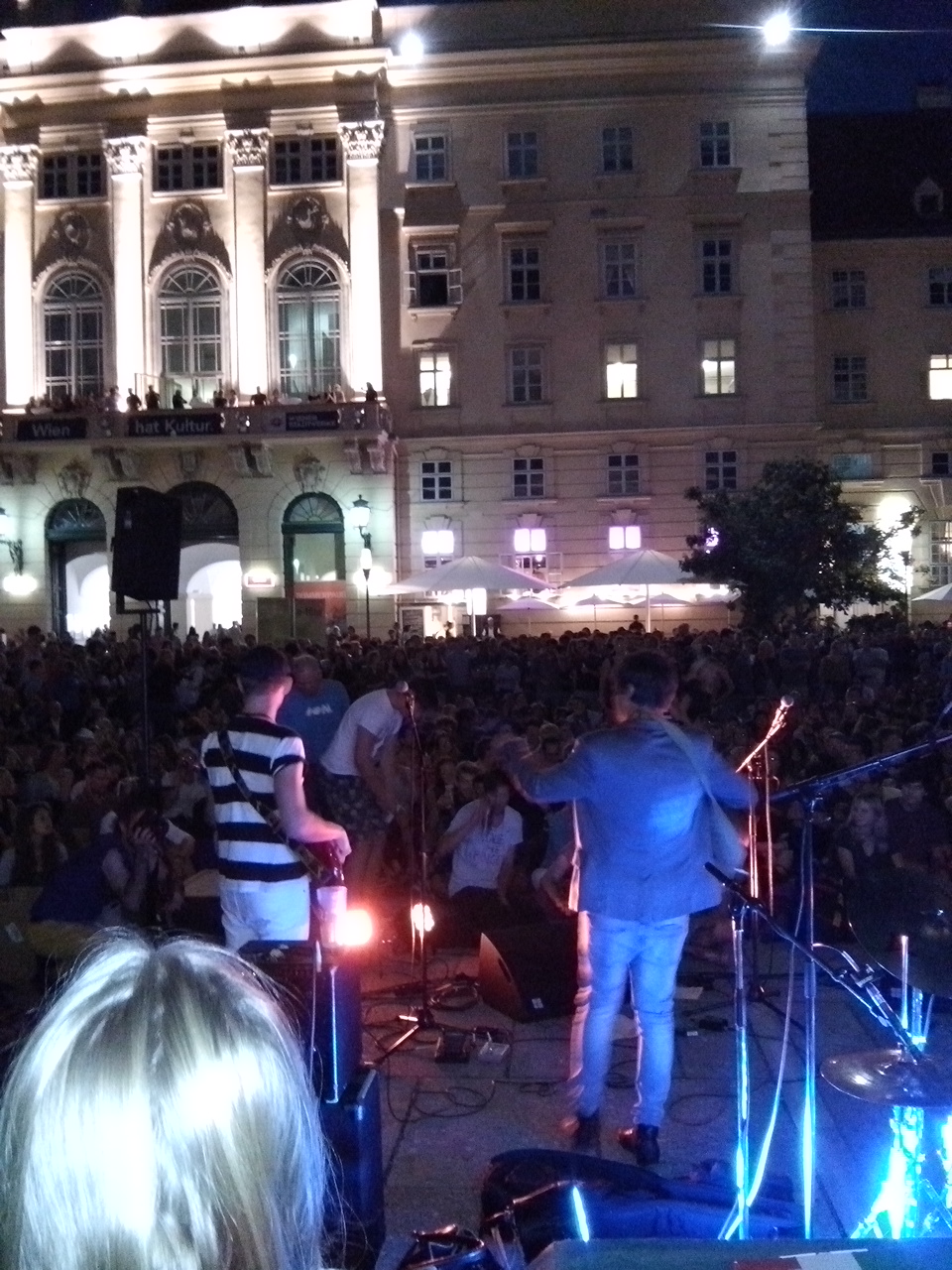 Der Spätabend war eingekehrt, die Bühne erleuchtete die Gebäude des MQ, welche in den Nachthimmel ragten und eine eindrucksvolle Kulisse ergaben. Das schunkelnde Schlusslied vom Vergessen wichtiger Dinge wie des Kapodasters und der Frage ob es die Klara aus dem Lied Du Oasch wirklich gibt, schloss dann das erste Set.